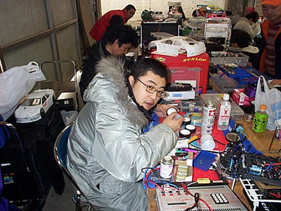 ゆたか氏せっせとダンパーをバラしているし、みぞ氏もなんかやってる・・・わしはもうタイヤしかないので、どっちかというとお気楽。何もせんもんね。既にタイヤは貼ってあるし。(^▽^ケケケ