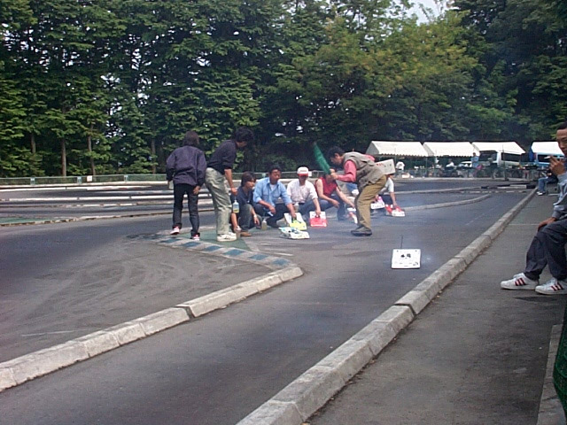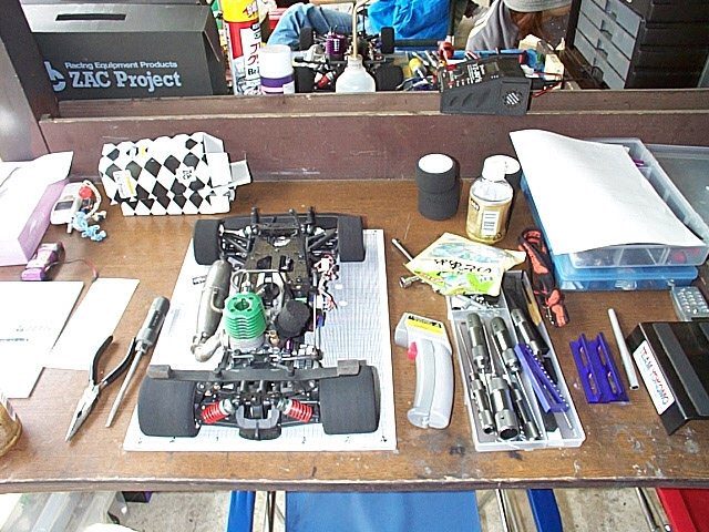 チーム無謀としては少々弱気ですが、ケイチューン以来ちゃんと走ってないので、前日にも行ってきました。 ラジコンできないので、時間さえあればあれこれいじくり回した結果、2mmショートホイールベース化/柔らか前脚/キャスターおっ立てと、初期重視に変わり果てた愛車に慣れないといけません。 なんでこうなったかを書くと長くなるので省略。(笑) とにかくEPで培った走り方で、長年GPで鍛えている人に勝つために、少しでも自分に有利な車にしたかったわけですが、これが思惑通りにいっているかどうかは走ってみないことには分かりません。 ドキドキしつつコースイン。 い〜じゃん、これ! ということで、セッティング終了。 ところが、肝心のエンジンが絶不調。ニードルが安定しないというより、全然出ない。 なにやってもダメなので、余ってるOSキャブに変更。少しは良くなったような気もするが・・・あんまり変わらないような気もする。(笑) これ以上どうしようもないので、本日終了。早く帰ってとっとと寝よ。